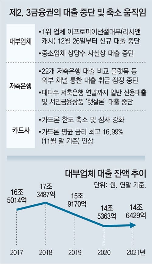 저축은행 카드론도 막혀 급전 구할 길 없는 서민들 돈줄 얼어붙어 대부업체도 줄줄이 대출 중단 추가대출 다 거절 이자 급등 가게월세 못낼 판 취약층 40만명 대출 퇴짜 소액 급전 문의 급증