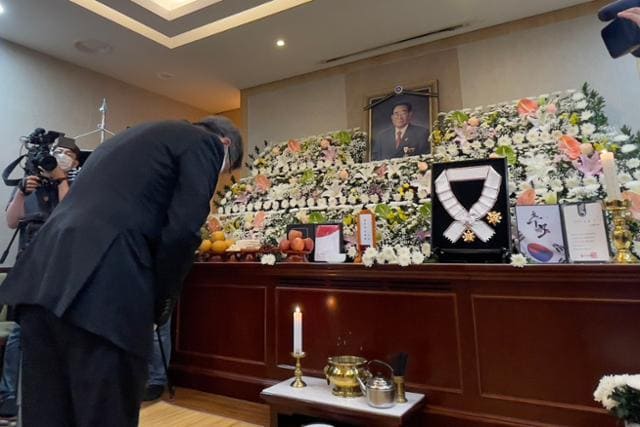 박보균 문화체육관광부 장관이 6월 8일 오후 서울 종로구 서울대학교 병원 장례식장에서 고(故) 송해에게 금관문화훈장을 수여하고 있다. 사진공동취재단
