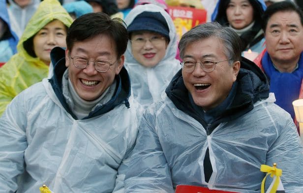2017년 3월 1일, 3·1절을 맞아 열린 탄핵 찬성 촛불집회에 더불어민주당 문재인 전 대표와 이재명 성남시장이 대화를 나누고 있다. /장련성 기자