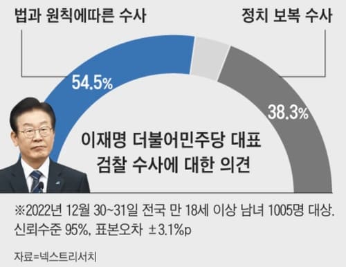 여론조사업체 넥스트리서치가 SBS 의뢰로 지난달 30~31일 진행한 조사에서 검찰의 이재명 더불어민주당 대표 수사에 대해 '법과 원칙에 따른 수사'라고 답한 비율은 절반(54.5%)을 넘었다.