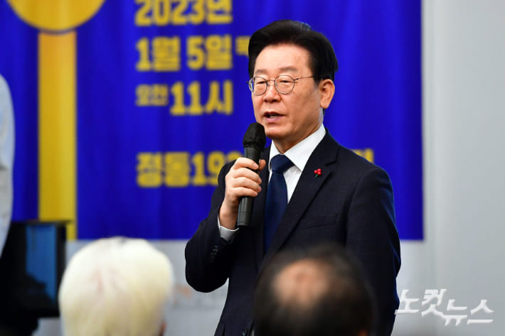 더불어민주당 이재명 대표가 5일 서울 중구 정동 1928 아트센터에서 열린 2023 시민사회단체 신년하례회에서 인사말을 하고 있다. 윤창원 기자