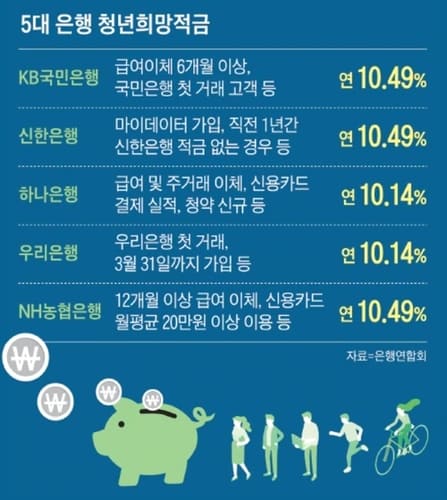 청년희망적금은 총급여 3600만원 이하인 만 19~34세를 대상으로 하는 자유 적립식 적금이다. 월 최고 50만원을 납입할 수 있고, 2년 만기를 채우면 정부 지원금까지 합쳐 연리 최고 10.49%를 받을 수 있어 인기를 끌었다. 평균 월 납입액은 41만원이다.