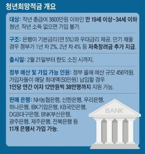 정부가 올 하반기에 2030세대를 대상으로 하는 ‘청년도약계좌’를 출시하면 해지가 더 늘어날 가능성도 있다. 5년 만기로 최고 5000만원을 마련할 수 있도록 지원하는 정책 금융 상품이다. 가입 대상 연령은 같고, 가입 자격은 개인 소득 연 6000만원 이하이며 가구 소득이 중위 소득의 180% 이하여야 한다. 금융권에서는 “2년짜리 청년희망적금도 중도 해지가 30만명에 이르는 것을 감안하면 만기 5년인 청년도약계좌의 해지율을 낮출 방법이 필요하다”고 말했다.