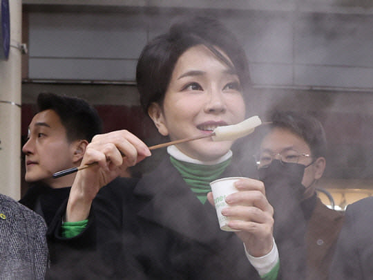 윤석열 대통령 부인 김건희 여사가 11일 대구 서문시장을 찾아 어묵을 맛보며 시장상인들과 대화하고 있다. 뉴시스
