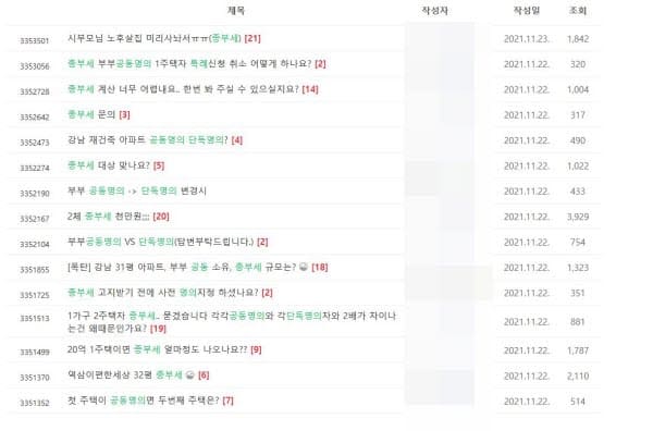 [땅집고]2021년 세법개정안이 통과되고 나서 온라인 부동산 커뮤니티에 종합부동산세와 관련해 명의 변경 여부를 질문하는 게시글이 부쩍 늘었다. /부동산 커뮤니티
