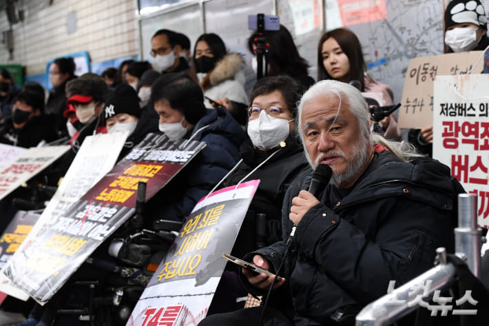 전장연은 3일 오전 서울 지하철 4호선 혜화역에서 '오세훈 서울시장과 대화에 대한 전장연 입장발표 기자회견'을 열었다. 양형욱 기자