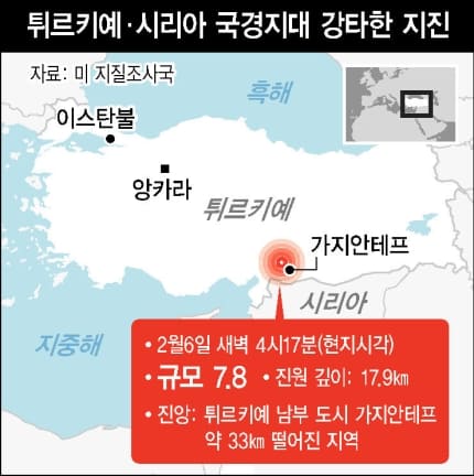 튀르키예는 아프리카판과 아라비아판 그리고 유라시아판에 끼어 있어 지진이 비교적 잦은 곳이다. 지난 1999년 북서부 이즈미트 지방에서 발생한 지진 때는 최소 1만8000명이 숨졌다. 1923년 9월 일본 도쿄 일대를 쑥대밭으로 만든 간토 대지진이 이번 지진과 규모가 비슷한 7.9였다.