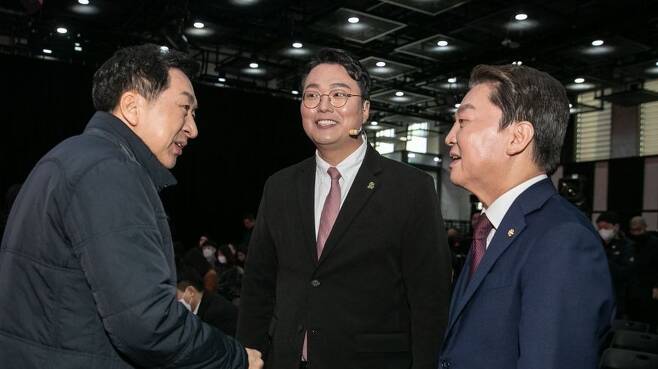 국민의힘 당 대표 후보로 출마하는 (왼쪽부터) 김기현 후보, 천하람 후보, 안철수 후보가 7일 오전 서울 강서구 ASSA빌딩 방송스튜디오에서 열린 국민의힘 제3차 전당대회 비전발표회에서 인사를 나누고 있다. /2023.2.7 국회사진기자단