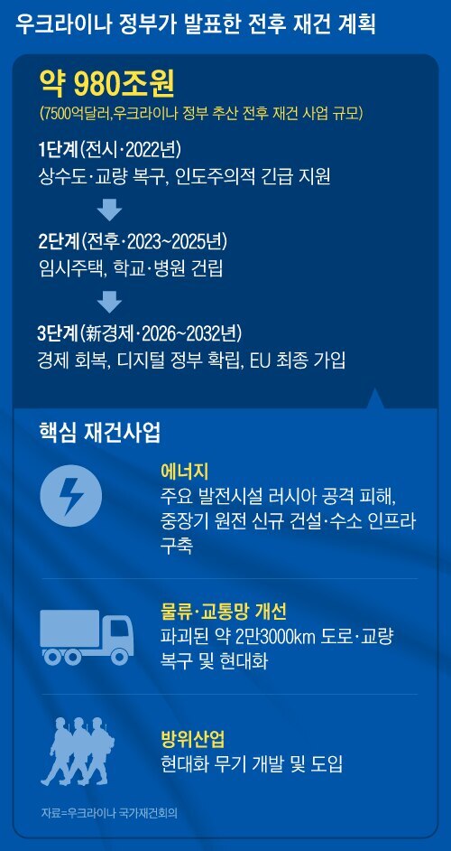작년 7월 스위스 루가노에서 열린 ‘우크라이나 재건회의’에서 우크라이나 정부가 추산한 전후 재건 사업 규모는 무려 7500억달러(약 980조원)에 이른다. 당시 발표한 총 3단계 재건 계획에 따라 2023~2025년을 ‘전후(post-war)’ 기간으로 정한 우크라이나 정부는 임시 주택, 학교·병원 건립을 위해 올초부터 민간 투자 유치에 본격적으로 나서고 있다.