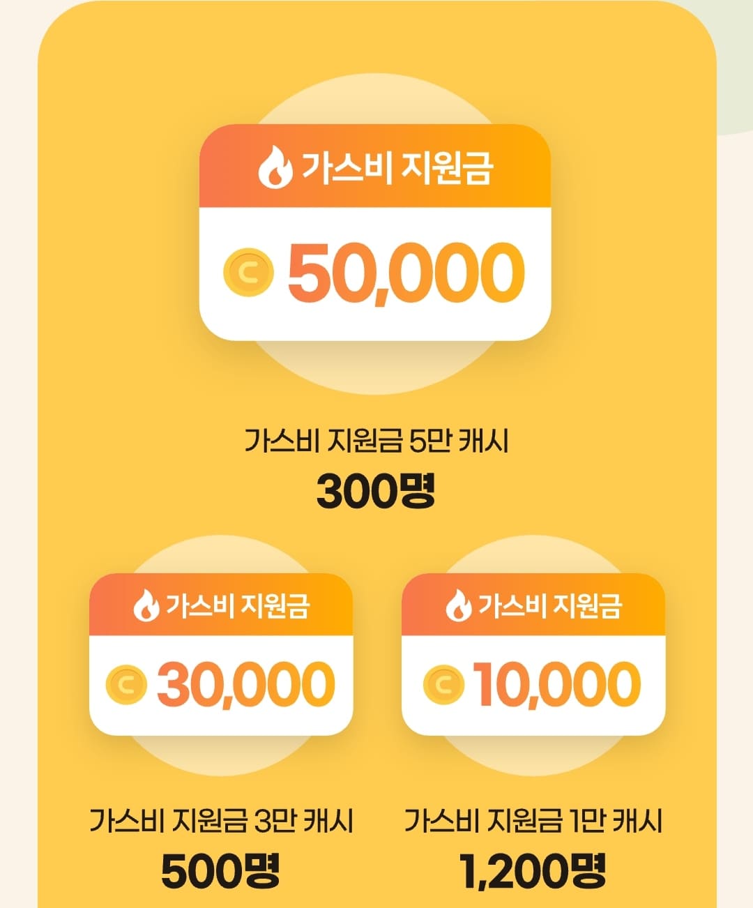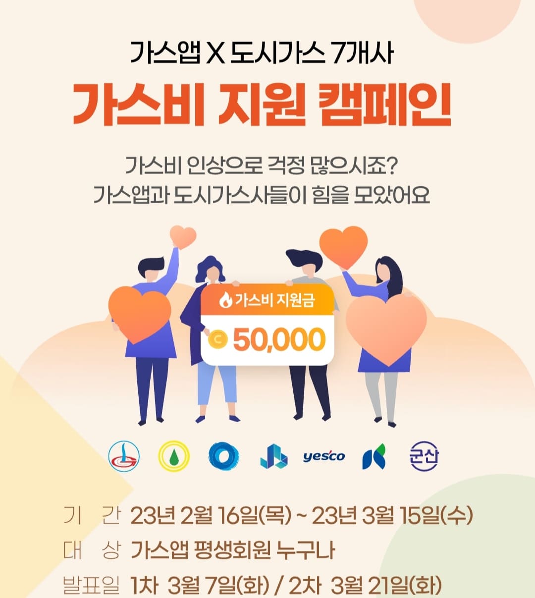가스앱 도시가스 7개사 가스비 지원 캠페인 가스비 인상으로 걱정 많으시죠? 가스앱과 도시가스사들이 힘을 모았어요 가스앱 평생회원 누구나 가스비지원금 최대 5만원