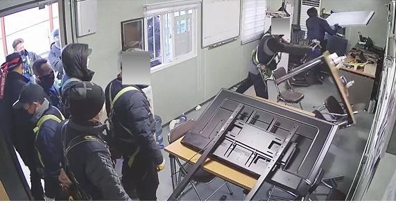 경기 광명시의 한 아파트 공사 현장 사무실에서 지난해 4월 노조원 채용을 강요하는 노조 관계자들이 현장을 점거하고 난동을 부리고 있다. 국토교통부는 타워크레인 노조의 월례비나 건설노조의 노조발전기금 요구 등 노조의 부당한 요구로 국가 경제에 피해가 크다고 강조했다. 국토교통부 제공