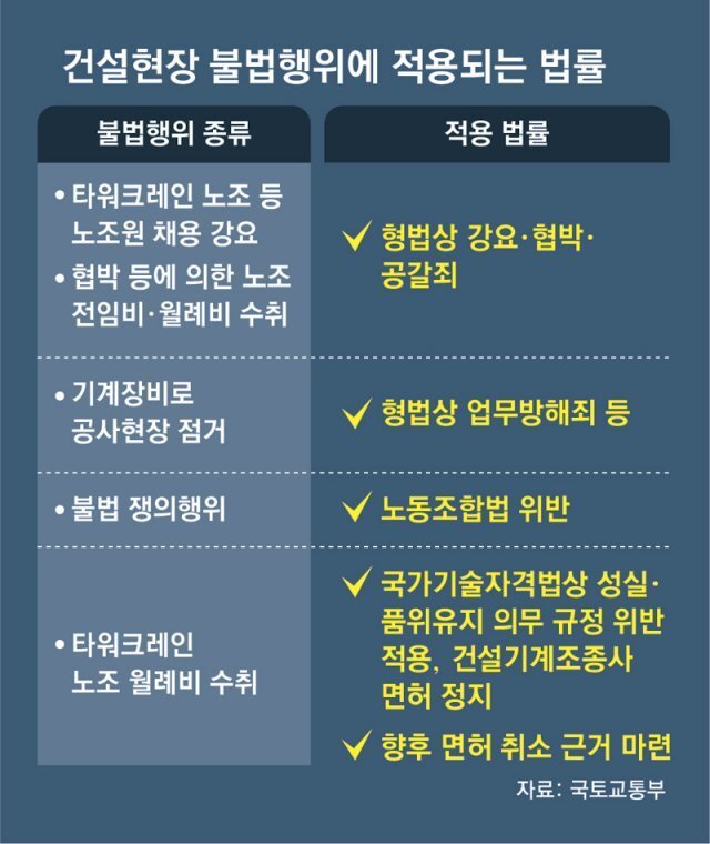 정부가 건설 현장 불법행위를 끊어내기 위해 칼을 빼 들었다. 3월부터 타워크레인 기사가 급여 이외에 별도로 이른바 ‘월례비’를 요구하면 최장 1년 동안 면허가 정지된다. 현장 점거 등 불법 행위에 대해 사업자 등록이나 면허를 취소하는 방안도 추진된다. 이는 타워크레인 기사 1명이 최고 2억2000만 원의 월례비를 받아내는 등 건설현장 노조 문제가 심각하다고 보기 때문이다.
