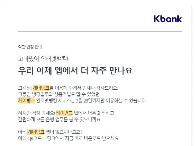 27일 업계에 따르면 케이뱅크는 인터넷뱅킹 서비스를 오는 3월 28일 중단한다. 지난 2017년 4월 서비스 개시 이후 약 6년 만이다. 케이뱅크 웹을 통한 서비스는 앞으로 '인증센터' 인증서 복사만 지원한다. 이에 따라 케이뱅크는 이용약관 14종과 설명서·약정서 13종을 서비스 변경에 맞게 개정했다.