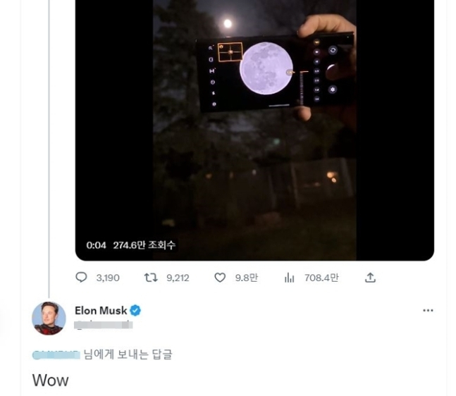 브라운리는 “달의 100배 확대 사진을 찍어야 하는 사람이 누군진 모르겠지만 갤럭시S23은 분명히 그 사람을 위한 폰”이라고 강조했다. 브라운리의 게시글이 올라온 지 약 5분 후 일론 머스크가 등장해 “와우” 라는 감탄사를 남겼다.