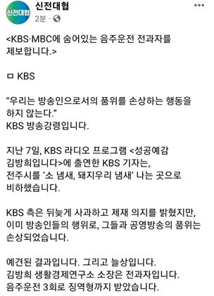 신전대협 "KBS·MBC에 숨어있는 음주운전 전과자를 제보한다"