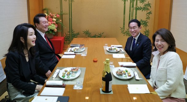1박2일간의 일정으로 일본을 방문한 윤석열 대통령과 김건희 여사가 기시다 후미오 일본 총리 부부와 16일 도쿄 긴자의 한 스키야키·샤부샤부 전문점에서 만찬을 하고 있다. 연합뉴스