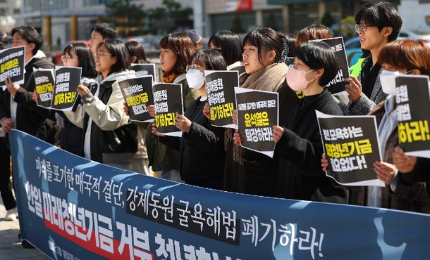16일 오후 서울 용산 대통령실 앞에서 '2015 한일합의 파기를 위한 대학생 공동행동' 관계자들이 일제 강제징용 피해배상 문제와 관련해 양국 재계가 조성하기로 한 '미래청년기금' 거부 청년학생 입장 발표 기자회견을 하고 있다. 연합뉴스