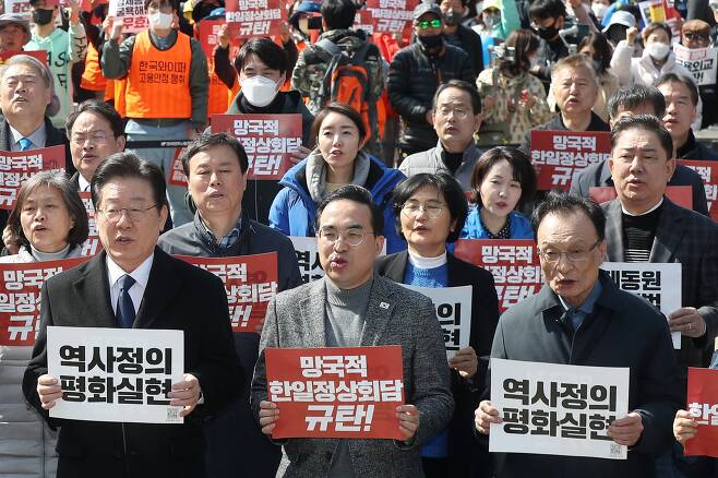 더불어민주당이 한일 정상회담을 놓고 “일본의 하수인” “윤석열 퇴진” 같은 표현을 쓰며 총공세를 펼치고 있다. 이 과정에서 이재명 대표는 18일 서울 시청광장에서 열린 ‘대일 굴욕외교 규탄 범국민대회’에서 지소미아(한일 군사정보보호협정·GSOMIA) 복원 등에 대해 “일본의 군사대국화 동조” “자위대 한반도 진주” 등 사실과 다른 극단적 주장까지 했다. 그는 정부의 ‘제3자 변제 방식’ 강제 징용 해결 방안과 관련해서도 “일본 비위만 맞춘 굴욕적 태도”라고 했다.