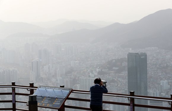 고비사막과 내몽골고원에서 발원한 황사가 부산지역에 유입된 지난해 황령산 봉수대 전망데크에서 내려다 본 도심이 뿌옇게 보이고 있다. [사진=뉴시스]