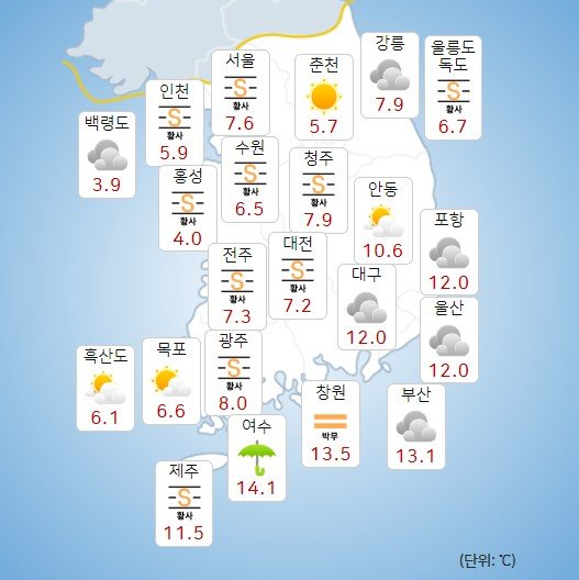 이날 기상청 등에 따르면 북서쪽에서 유입된 찬 공기 영향으로 기온은 어제보다 5~8도가량 낮겠으며 평년(최저기온 -2~6도, 최고기온 11~15도)과는 비슷하거나 조금 높겠다. 경기북부와 동부 지역, 강원내륙과 산지, 충청권내륙은 아침 기온이 0도 내외로 내려가 추위가 예상된다.