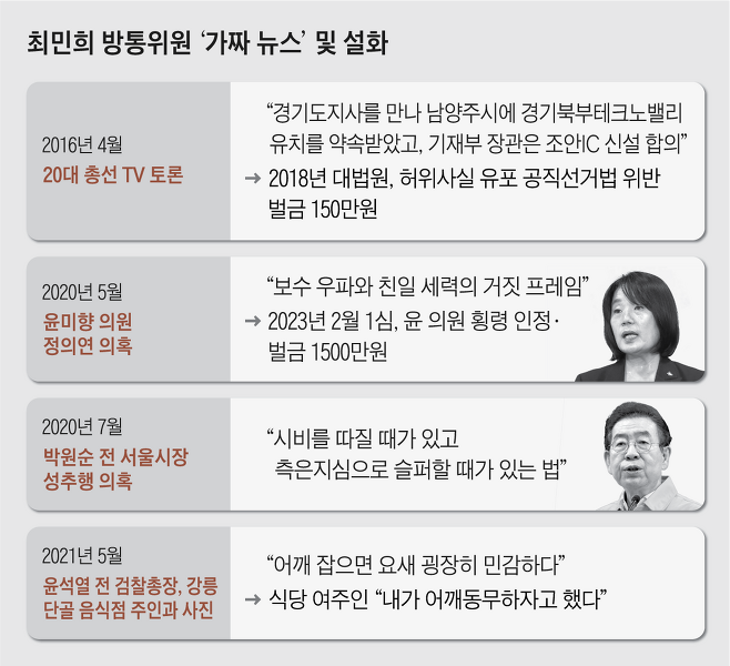 허위사실 퍼뜨려 벌금형 받았는데 尹 최민희 방통위원 임명거부 검토 야권 가짜뉴스로 친일공세 팩트체크도 없이 묻지마 정쟁몰이 허위사실 유포로 벌금형 방통위원으로 임명?