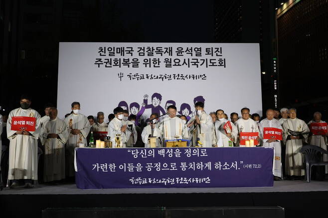 ‘정의구현전국사제단 비상대책위원회(사제단 비대위)’가 10일 저녁 서울광장에서 ‘친일매국 검찰독재정권 퇴진과 주권회복을 위한 월요 시국미사’를 열었다.