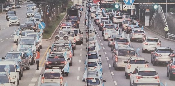 2020년 7월25일 서울 전역에서 이뤄진 ‘이석기 의원 석방 차량 시위’ 모습. 이 행사에 참여한 건설노조원은 "건설노조로부터 사실상 강제 차출 당했다"고 말했다. 왼쪽부터 2열 세번째 차량은 민노총 건설노조 차량. /건설노조 제공