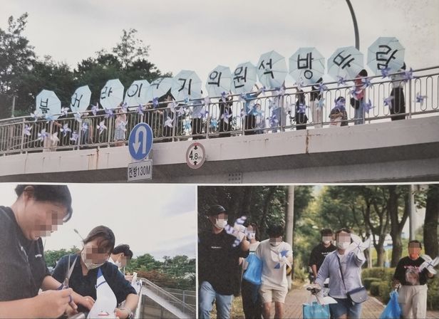 집회 참가자들이 뒤이어 통과하게 되는 육교들에는 “자주의 시대, 평화의 시대를 만드는 청년들이 이석기 의원의 석방을 함께합니다” “문재인 대통령님, 이제는 답해주십시오” 등의 현수막이 걸렸다. 네번째 육교에는 바람개비 수십여 개가 난간에 달렸고, 그 위로 주최 측이 섭외한 12명이 “불어라 이석기 의원 석방 바람”이란 글자가 각각 한자씩 적힌 우산을 들고 섰다.
