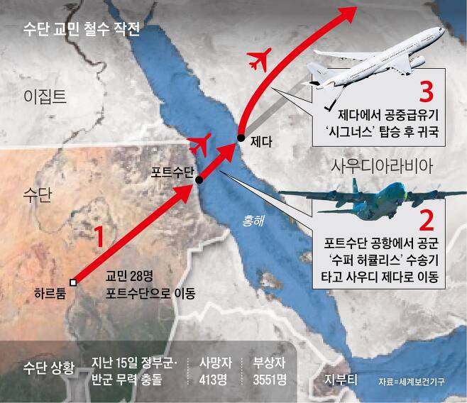 정부는 포트수단에 도착한 교민들을 대기 중인 공군 C-130J 수송기에 태워 사우디 제다로 이송했다. 앞서 정부는 지난 21일 C-130J를 수단 인접국인 지부티 주둔 미군 기지에 급파해 수단 투입 준비를 했었다. 정부는 수송기 이송이 어려울 경우를 대비해 지난 22일 오만 살랄라항에서 소말리아 해역 호송전대 청해부대를 수단 인근 해역으로 급파하기도 했다. 해상 이송도 대비했던 것이다. 청해부대 39진에는 충무공이순신함이 배속돼 있다.