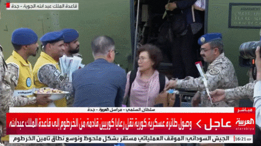 이제 살았다… 사우디 도착한 교민들 - 24일(현지 시각) 사우디아라비아 제다 공항에서 우리 교민들이 수송기에서 내린 뒤 활짝 웃고 있다. 내전이 발생한 북아프리카 수단의 우리 교민 28명은 수도 하르툼에서 동북쪽으로 약 850km 떨어진 홍해의 도시 포트수단으로 육로를 통해 이동한 뒤 대기 중이던 공군 수송기를 타고 제다로 향했다. /알아라비야 방송 캡처