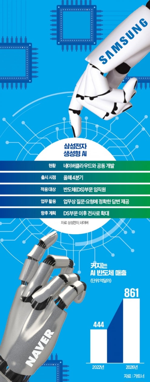 삼성전자가 네이버와 함께 반도체(DS)부문 임직원 전용으로 ‘챗GPT’ 같은 생성형 인공지능(AI) 서비스를 개발 중이다. 이 서비스가 나오면 DS부문 임직원들은 기밀 유출 걱정 없이 AI 챗봇 등을 업무에 활용하며 생산성을 높일 수 있을 것으로 전망된다. 네이버에도 자사 생성형 AI 기술의 우수성을 입증하고 글로벌 기업들을 고객사로 확보할 수 있는 발판이 될 것이란 평가가 나온다.