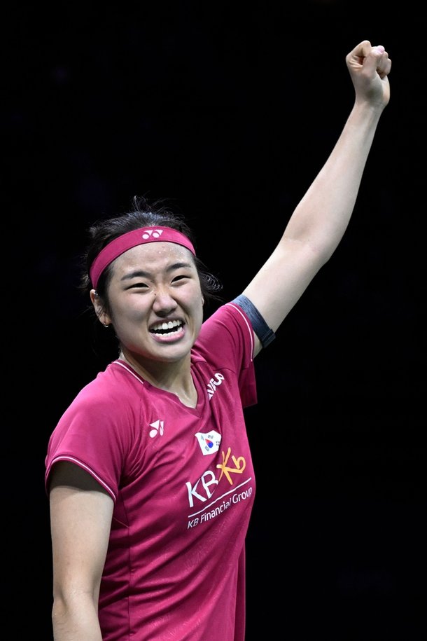 여자단식에서 승리한 안세영의 환호. 쑤저우| AFP 연합뉴스