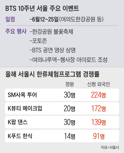 서울시는 기획사인 하이브와 ‘아미 마중’을 준비 중이다. 서울시 등에 따르면, 하이브·서울시는 다음 달 12일부터 25일까지 2주간을 이른바 ‘BTS 데뷔 10주년 관광 주간’으로 정하고 다양한 이벤트를 열 계획이다. 메인 이벤트는 6월 17일 여의도 한강공원에서 열리는 것으로 알려졌다. 관광 업계 관계자는 “BTS 데뷔 10주년을 축하하는 대규모 불꽃 축제를 열고 포토존도 마련하는 것으로 알려져 있다”고 말했다.