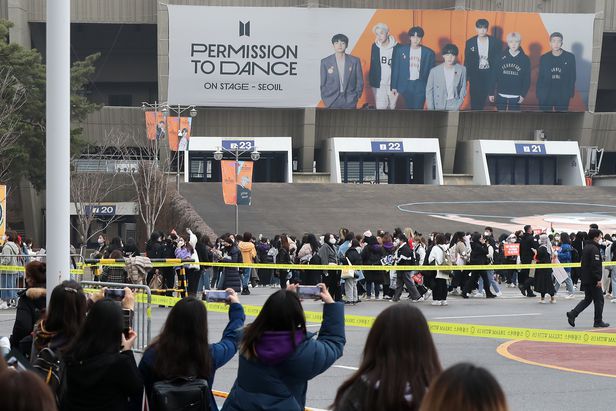 지난해 3월 그룹 ‘방탄소년단’(BTS)의 ‘BTS 퍼미션 투 댄스 온 스테이지 - 서울’ 공연이 열린 서울 송파구 잠실주경기장. 콘서트장을 찾은 외국인 팬들이 사진을 찍고 있는 모습. 코로나 여파로 2년 반 만에 열린 당시 콘서트는 3일 동안 3차례 공연에 총 국내외 관람객 4만5000여 명이 몰렸다. /뉴스1