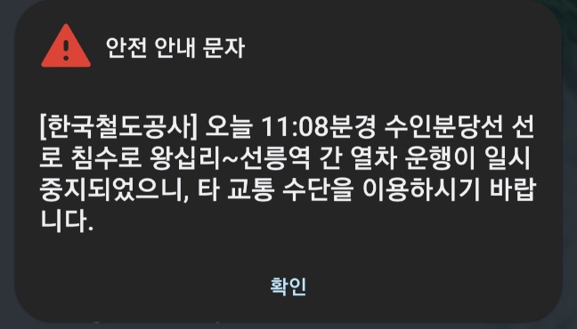 안전 안내 문자 [한국철도공사] 오늘 11:08분경 수인분당선 선로 침수로 왕십리~선릉역 간 열차 운행이 일시 중지되었으니, 타 교통 수단을 이용하시기 바랍니다. 열차 운행(서행)을 재개