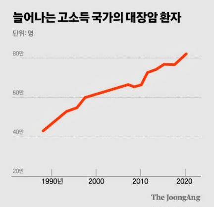 지난해 한 국제 공동연구에 따르면 1990년 84만 명이던 세계 대장암 환자는 2019년 217만 명으로 두 배 넘게 뛰었습니다. 대장암의 폭발적 증가를 이끄는 건 선진국입니다. 선진국은 여러 보건 지표에서 후진국을 앞서고 있는데, 대장암만큼은 거꾸로 갑니다.