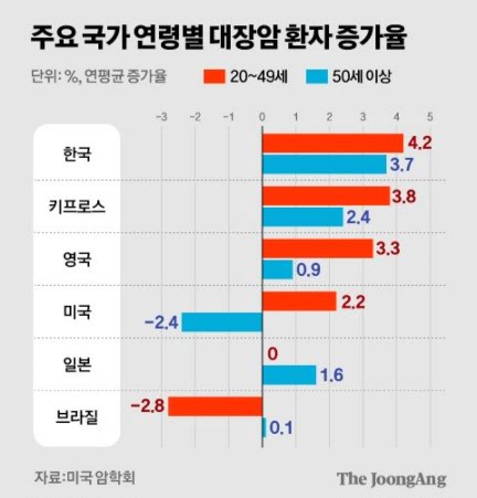50세 미만의 젊은 대장암 환자가 늘고 있다는 점이 핵심 원인으로 지목됩니다. 2019년 미국 암학회가 42개국 대장암 환자를 대상으로 실시한 조사에 따르면 50세 이상 연령대에선 일부 선진국의 경우 대장암 환자 수가 줄었지만, 50세 미만에선 대부분 증가세를 보였습니다.