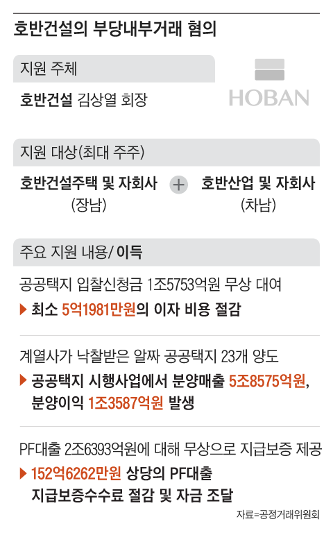 두 아들의 회사가 시행하는 40개 공공택지 사업의 프로젝트 파이낸싱(PF) 대출 총 2조6393억원에 대해서도 호반건설이 무상으로 지급보증을 제공했다. 2세 회사의 자체 신용만으로는 금융기관으로부터 대출을 받을 수 없자 호반건설이 도와준 것이다. 공정위는 2세 회사들이 내야 할 PF대출 지급보증 수수료를 절감해 최소 152억6262만원 상당의 이득을 봤다고 추산했다.