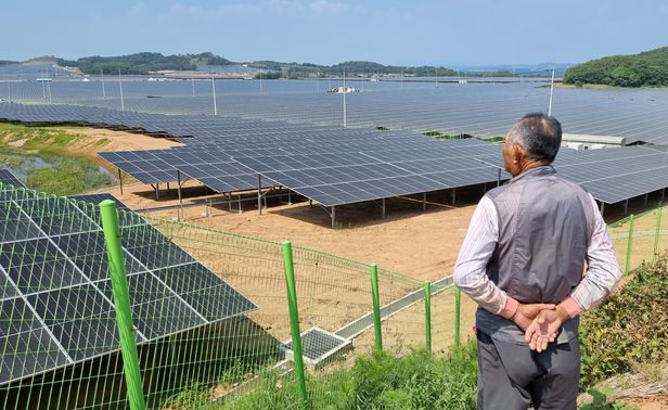 15일 오후 충남 태안 안면도 중장리 폐염전 부지에 국내 최대 태양광발전단지가 조성되고 있는 가운데 한 주민이 공사현장을 바라보고 있다. /신현종 기자