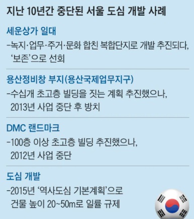 일본 도쿄 마루노우치와 롯폰기힐스, 미국 뉴욕의 허드슨야드, 프랑스 파리의 리브고슈 등 세계 주요 도시들이 낡은 도심을 복합 개발해 도시 경쟁력을 키우고 있다. 하지만 서울에서는 추진되다가 멈춰버린 대형 개발 프로젝트들이 잇따르고 있다. 특히 박원순 전 시장 재임 10년 동안 근대 역사 보존을 명목으로 개발을 억제하면서 ‘서울 도심 재생의 시계’는 멈춰버렸다는 평가도 나온다.
