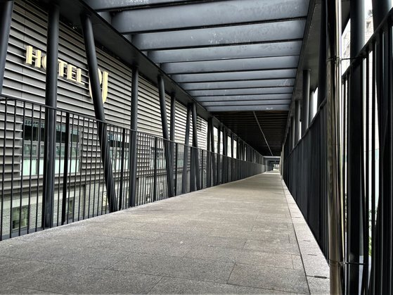 서울 중구 호텔PJ 건물 양 옆으로 서울시가 조성한 공중보행로. 7일 유동인구가 드물어 한산한 모습이다. 문희철 기자