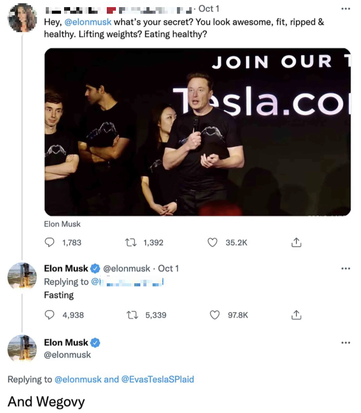 어떻게 체중 감량을 했냐는 트위터 유저의 질문에 일론 머스크가 '위고비'라고 답했다. 일론 머스크 트위터 캡처