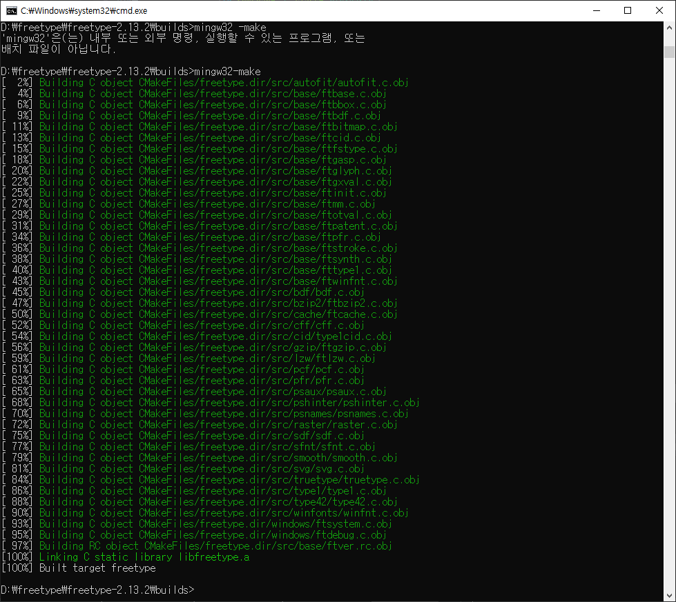 cd C:\freetype-2.13.2\buildscmake -G "MinGW Makefiles" ..