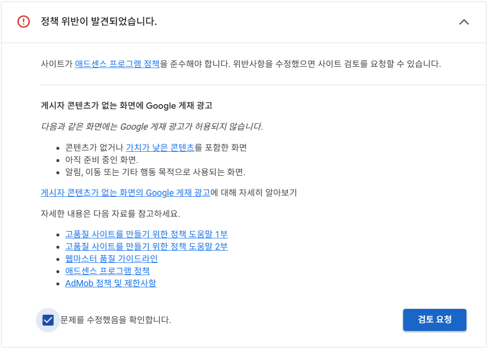 그 뒤로 오랜 기간동안 블로그를 운영했지만, 그동안 애드센스가 좋아하지 않는 포스팅이 늘었다는 걸로 이해된다.