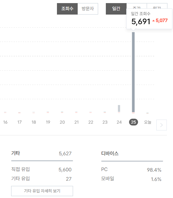 이걸 보고서 확실히 알 수 있었다. 갑작스럽게 평소와 다른 유입자 수가 기록됐고, 그 뒤에도 평소처럼 카운팅이 되었으니 말이다.