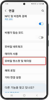 2. '모바일 핫스팟 및 테더링' 선택